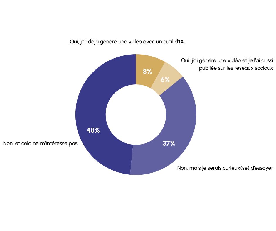 Mais l’étude révèle aussi une curiosité comme vu précédemment : un tiers des répondants se disent prêts à essayer un outil IA pour générer une vidéo. L’IA vidéo n’est pas encore un réflexe… mais elle intrigue. Même parmi les plus réfractaires, l’envie d’expérimenter existe.